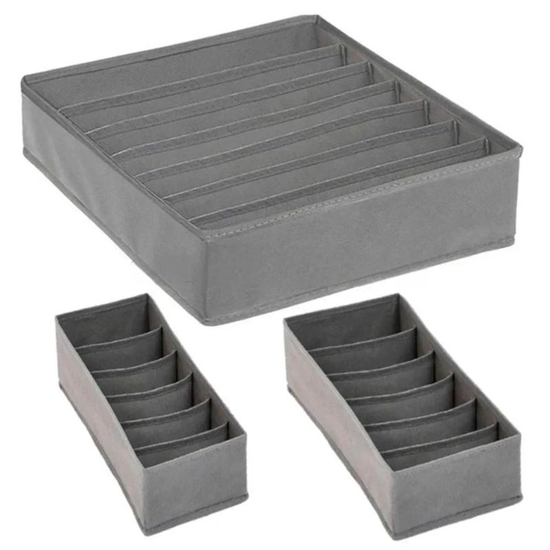 Органайзер -- идеальное решение для порядка в шкафу, а также для экономии вашего времени во время сборов на работу или прогулку! Преимущества: - Универсален в использовании - Организация удобного хранения - Можно использовать во время поездок - В сложенном виде занимает мало места - Вещи в этом органайзере дышат - Экономит место в шкафу или комоде - Набор включает 3 органайзера разного размера Описание: Органайзер универсален и предназначен для многих вещей. Он поможет сэкономить место, значительно упростит организацию вещей в вашем доме, а также поиск нужной вещи, когда спешишь. Его можно использовать в шкафу, в гардеробной, комоде и других ящиках. Это очень удобно, ведь у каждой вещи есть своё место в ячейке. Органайзер складывается, поэтому вы с легкостью упакуете его, если вам это будет нужно. С этим органайзером ваше белье всегда будет аккуратно сложено, что смотрится очень эстетично. Также вещи будут иметь возможность дышать, благодаря сетчастому материалу. Также, благодаря светлому тону органайзера, всегда видно степень его загрязения, и при необходимости его можно постирать. Характеристики: - Тип: органайзер для белья / органайзер для одежды - Материал: спанбонд; - Количество органайзеров: 3; - Назначение: для хранения одежды; - Цвет: серый; - Размеры: 37х19х13 см, 34х13х13 см, 34х34х13 см - Вес: 320 г. Комплектация: - Органайзер для хранения белья 3 шт; - Упаковка