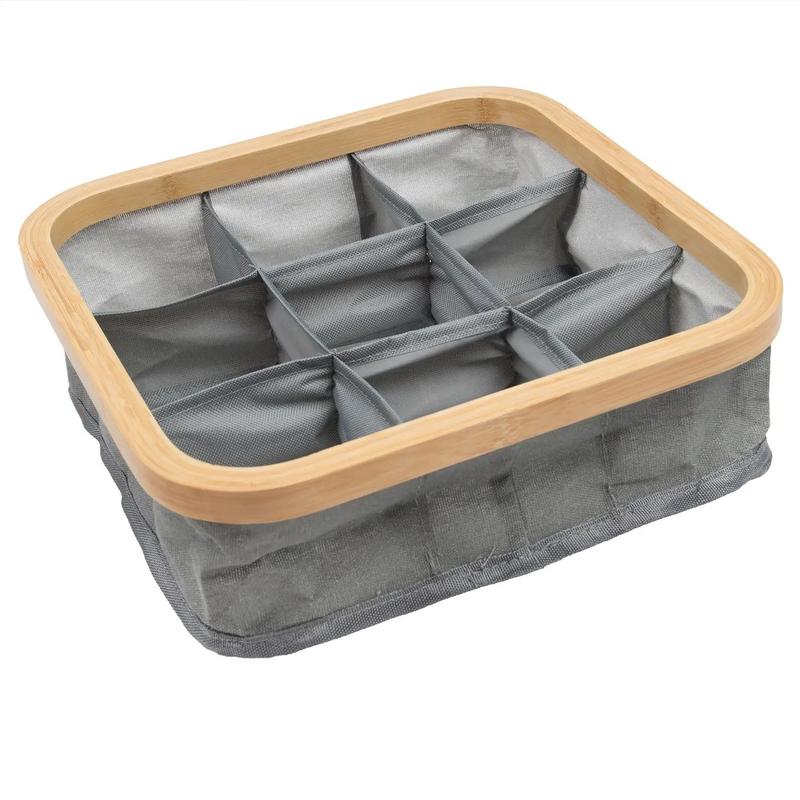 Органайзер для белья из бамбука -- стильное и функциональное решение для вашего дома. Он помогает эффективно организовать пространство, обеспечивая удобство хранения вещей и гармонично дополняя любой интерьер. Удобное хранение для вашего комфорта Бамбуковый органайзер имеет 9 отделений, которые позволяют легко сортировать белье, аксессуары или другие мелочи. Он идеально подходит для использования в шкафах, комодах или на полках, помогая поддерживать порядок и быстро находить нужные вещи. Экологичность и современный дизайн Этот органайзер изготовлен из высококачественных и долговечных материалов: прочной ткани и натурального бамбука. Нейтральный серый цвет придает изделию минималистичный вид, который отлично впишется в любой стиль интерьера. Кроме того, бамбук является экологически чистым материалом, способствующим сохранению окружающей среды. Практичность и универсальность Благодаря компактным размерам органайзер легко разместить в шкафу, ящике или на столе. Это идеальное решение для организации домашнего пространства или рабочего места. Основные преимущества органайзера: - 9 отделений: для аккуратного хранения белья, аксессуаров или других вещей. - Прочные материалы: сочетание прочной ткани и бамбука для долговечности. - Экологичность: использование натуральных и безопасных компонентов. - Современный вид: минималистичный дизайн в сером цвете. - Универсальность: подходит для использования в любом пространстве. Бамбуковый органайзер для белья -- это сочетание стиля, практичности и заботы об окружающей среде. Приведите свои вещи в порядок легко и с комфортом! Характеристики: - Материал: Ткань, бамбук - Цвет: Серый - Вес: 255 г - Размеры (ДхШхВ): 30X30X9,5 см - Упаковка: Пакет - Вес в упаковке: 260 г - Размеры в упаковке: 34x30x3 см - Размеры одной отделения: 3x9,5x9,5 см - Страна производитель товара: Китай
