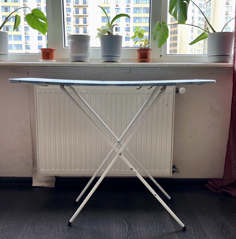 Основа - ДСП товщиною 16 мм. Регулюється по висоті - від 75 до 84 см. Пластикові ковпачки на ніжках не царарають підлогу. Габарити в складеному стані - 119х31.5х3,5 см. В комплекті металева підставка для праски.