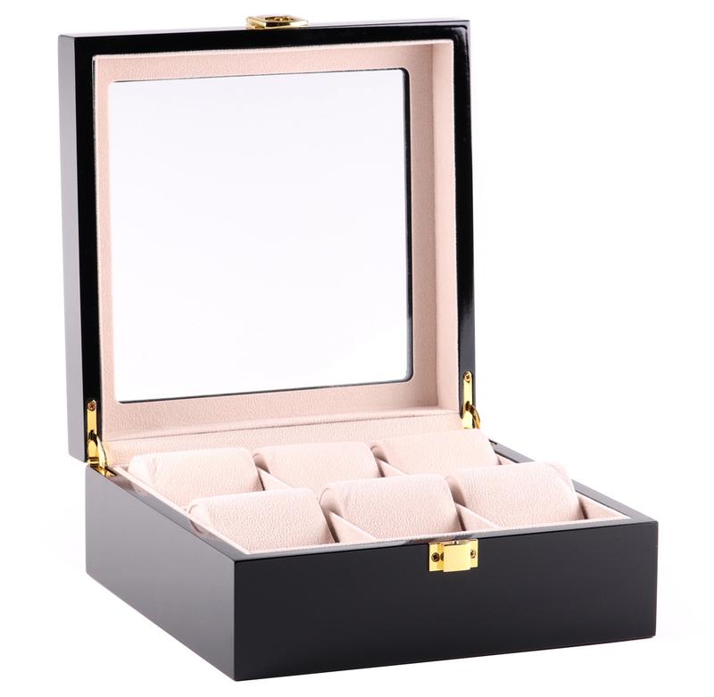 Шкатулка для хранения 6-ти часов. Материал корпуса - дерево, стекло. Цвет - черный глянцевый. Интерьер - светлый бархат. Производитель - компания Craft, Тайвань. Размер: 21x21x8 см Ширина ячейки 6см.
