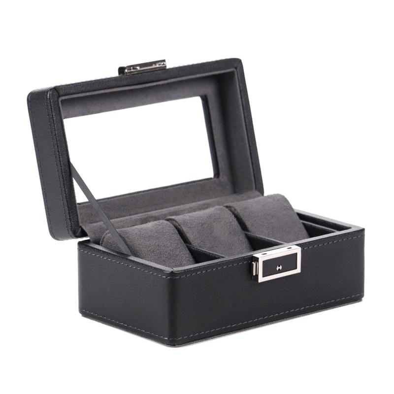 Шкатулка для неподвижного хранения 3-х часов. Материал корпуса - PU кожа. Цвет - черный. Интерьер - темный бархат. Размер шкатулки: 18х10,5х8,5 см. Производитель - компания Salvadore, Австрия.