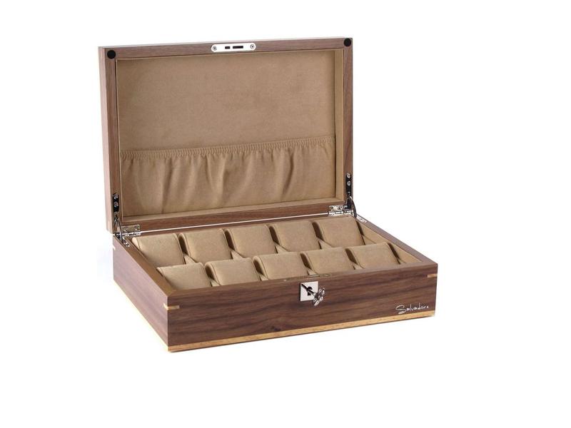 Шкатулка для неподвижного хранения 10-ти часов. Материал корпуса - дерево. Цвет - коричневый, матовое покрытие. Интерьер - бархат светлого цвета. Производитель - компания Salvadore, Австрия. Размеры: 30,5х21х9,5 см