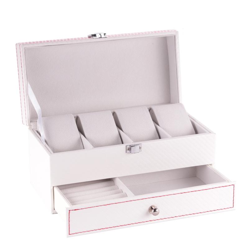 Шкатулка для хранения 4-х часов. Отделение для хранения ювелирных украшений. Материал корпуса - PVC кожа c тиснением под карбон. Цвет - белый. Интерьер - светлый бархат. Производитель - компания Craft, Тайвань. Размеры: 22,5х10,8х10,4 см