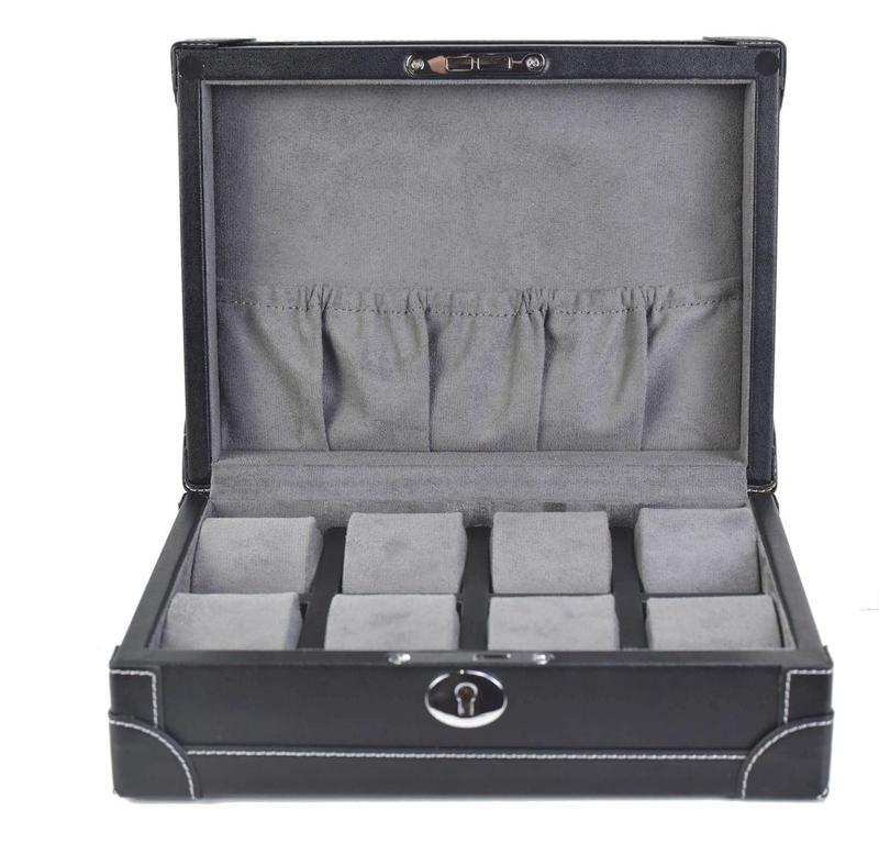 Шкатулка для неподвижного хранения 8-ми часов. Материал корпуса - MF кожа (Microfiber synthetic leather). Цвет - черный. Интерьер - бархат серого цвета. Замок с ключом. Производитель - компания Salvadore, Австрия. Размер: 26x19x9 cм