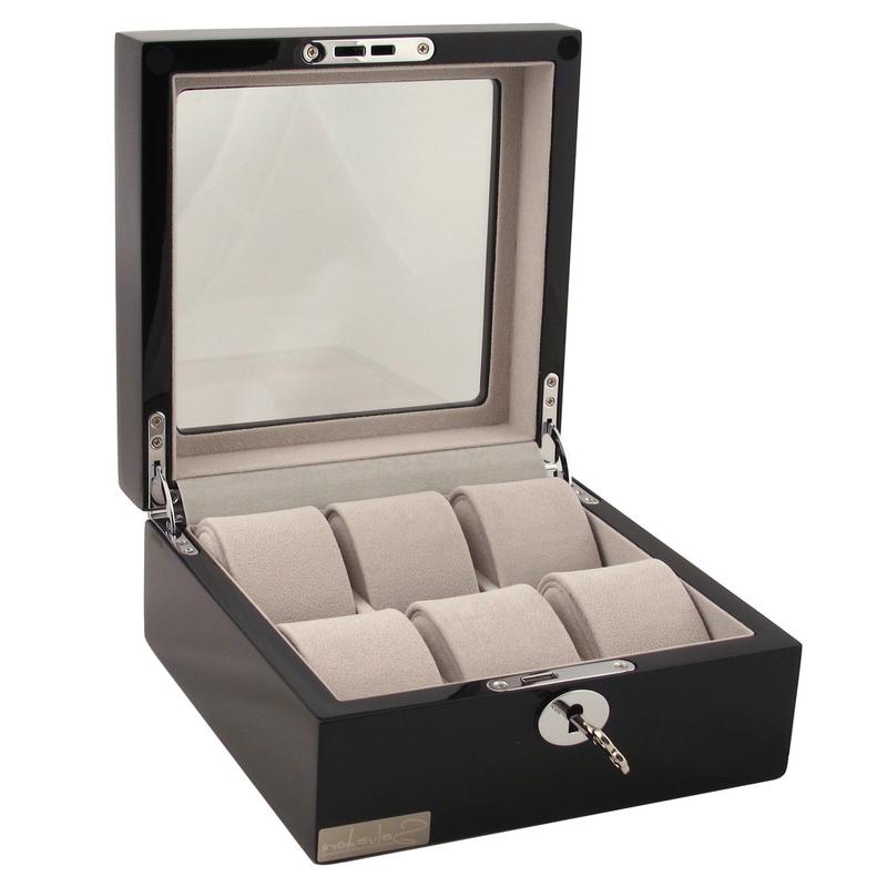 Шкатулка для неподвижного хранения 6-ти часов. Материал корпуса - дерево. Цвет - черный. Интерьер - бархат серого цвета. Производитель - компания Salvadore, Австрия Размеры: 19х19х9 см
