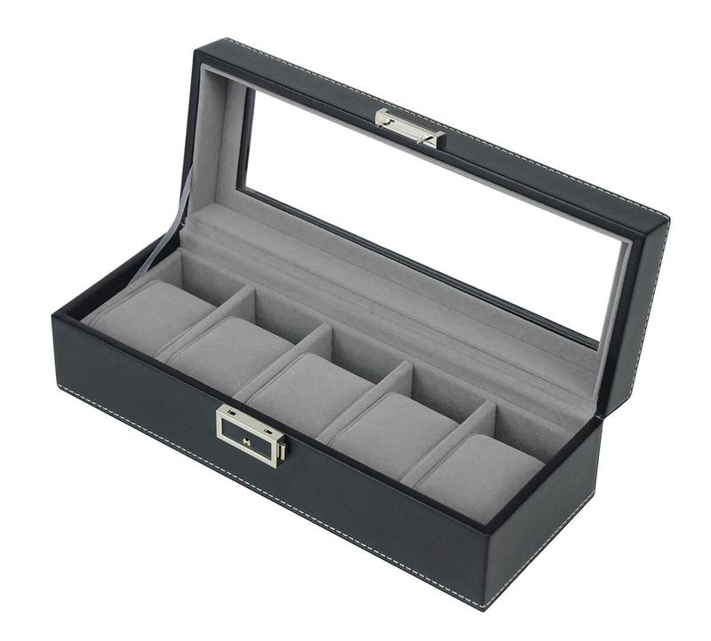 Шкатулка для неподвижного хранения 5-ти часов. Материал корпуса - PU кожа. Цвет - черный. Интерьер - бархат серого цвета. Замок с ключом. Производитель - компания Salvadore, Австрия. Размер шкатулки: 27,5х10,5х8,5 см