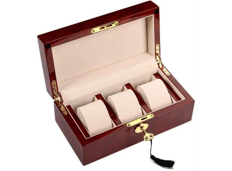 Шкатулка для нерухомого зберігання 3-х годинників. Матеріал корпусу - дерево, вкрите лаком. Колір - коричневий. Інтер'єр - оксамит світлого кольору. Виробник - компанія Salvadore, Австрія. Розміри: 23х12х9 см