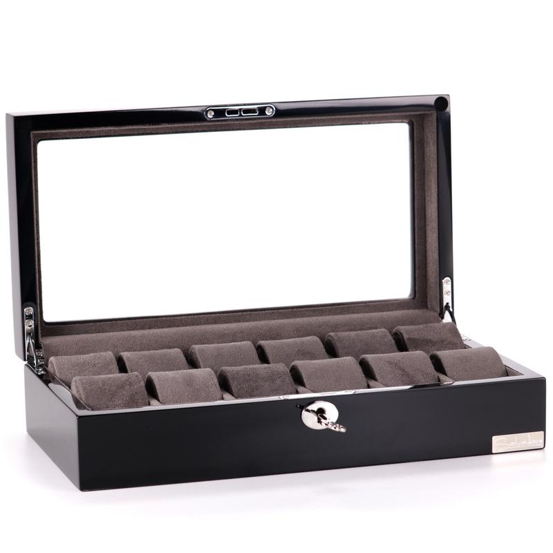 Скринька для нерухомого зберігання 12-ти годинників. Матеріал корпусу - дерево. Колір - чорний. Інтер'єр - сірий оксамит. Виробник - компанія Salvadore, Австрія. Розміри: 34,5х18,5х9 см