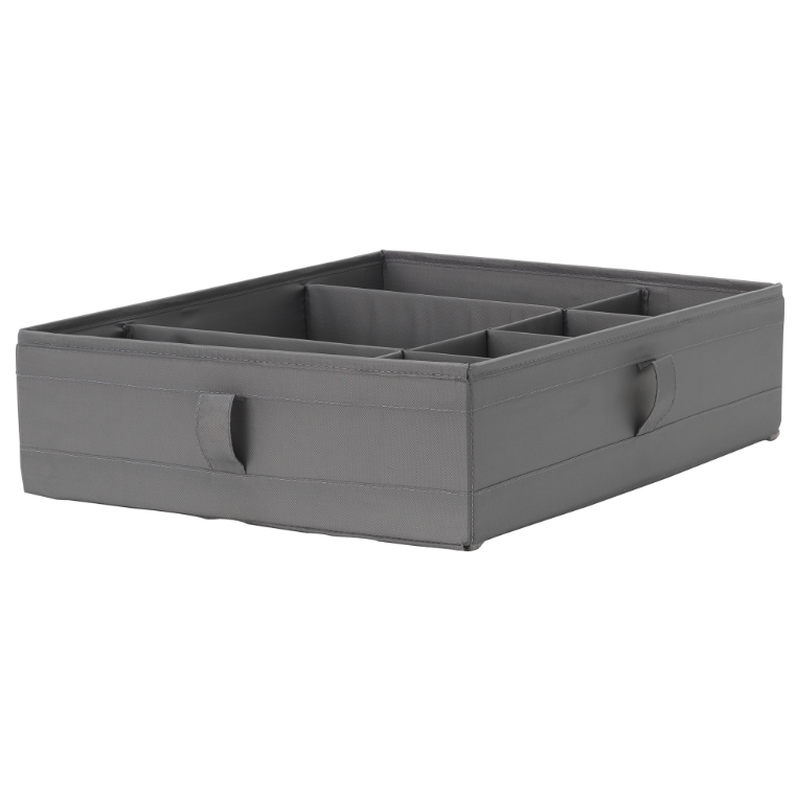 Размеры товара: Ширина: 44 см Глубина: 34 см Высота: 11 см Главные черты: Помогает упорядочить носки, ремни или украшения в шкафу или комоде. Ручки, расположенные с обеих сторон коробки, облегчают ее извлечение независимо от положения. Когда коробка не нужна и вы хотите сэкономить место, просто откройте молнию и сложите коробку на плоско. Изделие изготовлено из полиэстера, который не менее на 90% происходит из переработки. Инструкция по уходу: Очищайте пилососом або роликом для одягу. Не прати Не отбеливать. Не сушить в барабанной сушилке. Не гладить. Не подвергать химической чистке. Материалы и уход: Тканина: 100% полиэстер (минимум 90% из переработки) Вкладиш: полипропилен