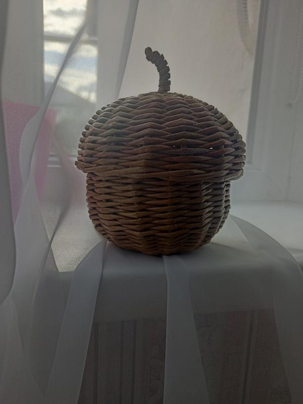 Корзины сплетены из цеколозы. Для хранения и декора. В желуде можно хранить горшки. Уход как за деревянным изделием. Размеры:диаметр 20 см,высота 8.5 см; желудь высота 14 см (без хвостика). Цена 300 грн за одну корзину.Набор стоит 550 грн.