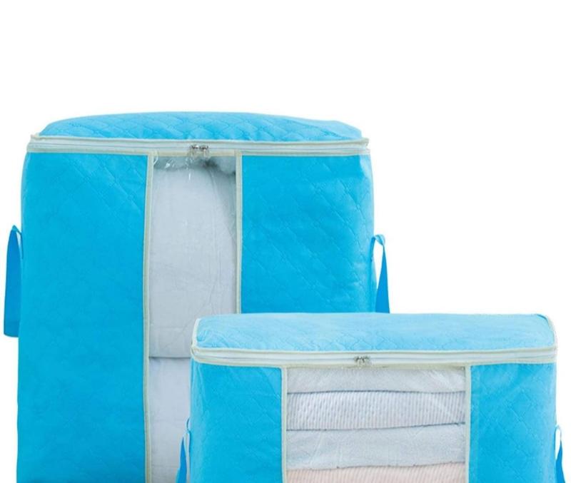 Складна містка сумка для зберігання одягу, органайзер для підковдр, ковдр, постільної білизни. У ньому помістяться покривала, подушки, м'які іграшки, костюми та інший одяг. Матеріал: виготовлений з високоякісного тришарового композитного нетканого матеріалу без запаху, який сприяє вентиляції і захищає зберігаються предмети від вологи і пилу. Блискавка з нержавіючої сталі. Колір: блакитний. Розмір: 60*40*35 см.