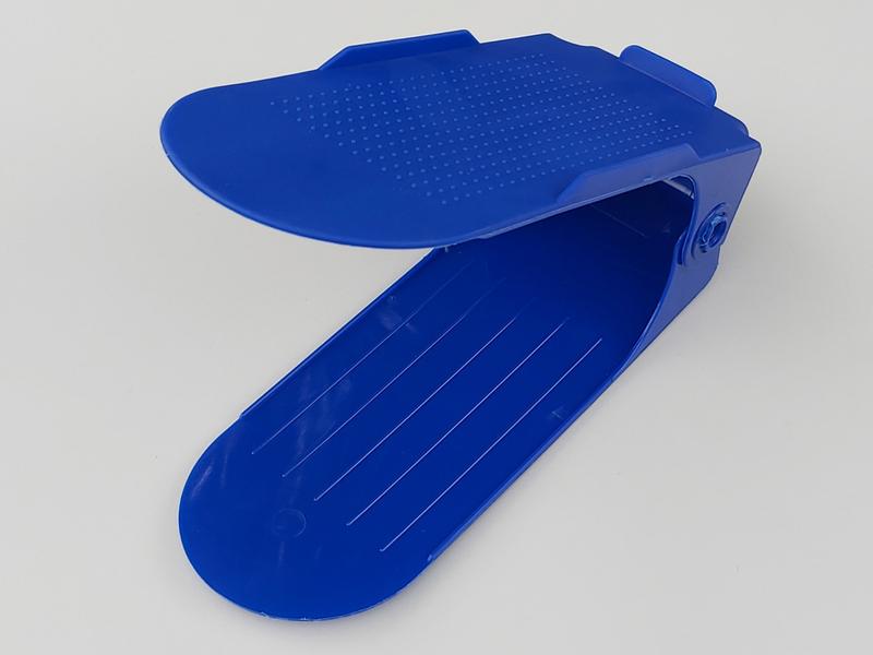 Двойная подставка-органайзер для обуви синего цвета. Размеры длинна 25 см, максимальная высота 16 см и ширина 10 см. Регулируется по высоте в 3 положениях. Данная подставка просто незаменима в домашнем быту. У нее есть несколько преимуществ. 1. Она значительно экономит место в прихожей или в гардеробной, теперь вместо одной пары обуви, вы можете поставить две пары. 2. Стильный дизайн данной подставки подойдет к любому интерьеру. 3. На подставке есть ребристая поверхность, что предотвращает соскальзывание обуви. 4. Также подставка имеет 4 уровня регулировки высоты, что очень удобно, можно разместить разные виды обуви, как кроссовки, так и туфли на каблуке или платформе. 5. Благодаря подставке ваш пол или ковер всегда будут чистыми. 6. И последнее, теперь вся ваша обувь в чистоте и порядке, ее можно легко найти, стоит всего лишь протянуть руку.