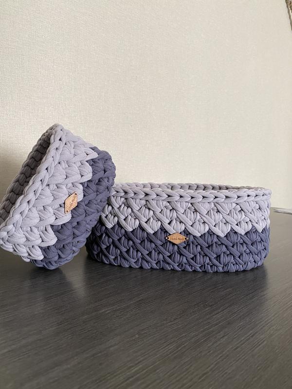 Набор серых овальных корзин из трикотажной пряжи на деревянных денцах. Отличная большая корзина очень вместительная, в нее удобно сложить что бы от бутылочек с уходовыми средствами до мелкой техники. Дополнительная маленькая корзина дополнит комплект и сможет организовать вашу декоративную косметику. Выполнены из качественной трикотажной пряжи, эти экологичные и стильные корзины-органайзеры добавят уюта вашему дому. Размеры: Великий: 25х15,5см, h-10см Маленький: 15х10,5см, h-9см Цвет: темно-серый/светло-серый Склад: 100% бавовна, дерево Уход: сухая чистка мягкой щеткой. crochetbasketua В наличии. Цена набора 800 грн Отдельно: 550 грн больше и 300 грн