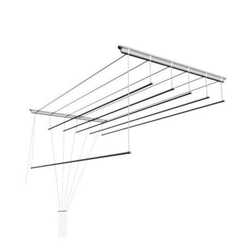 9Сушка для белья потолочная с веревочным механизмом опускания планок. Сушка имеет 6 (шесть) круглых прутьев с нержавеющей стали Выдерживает нагрузку до 15 кг белья. Специальный механизм обеспечивает подъем и опускание стержней независимо друг от друга, что облегчает процесс развешивания белья. Возможность зафиксировать стержни на любой удобной высоте. Материал: нержавеющая сталь, потолочный крепеж выполнен из прочного пластика. Полезная площадь (сумма всех перекладин) - 9 м