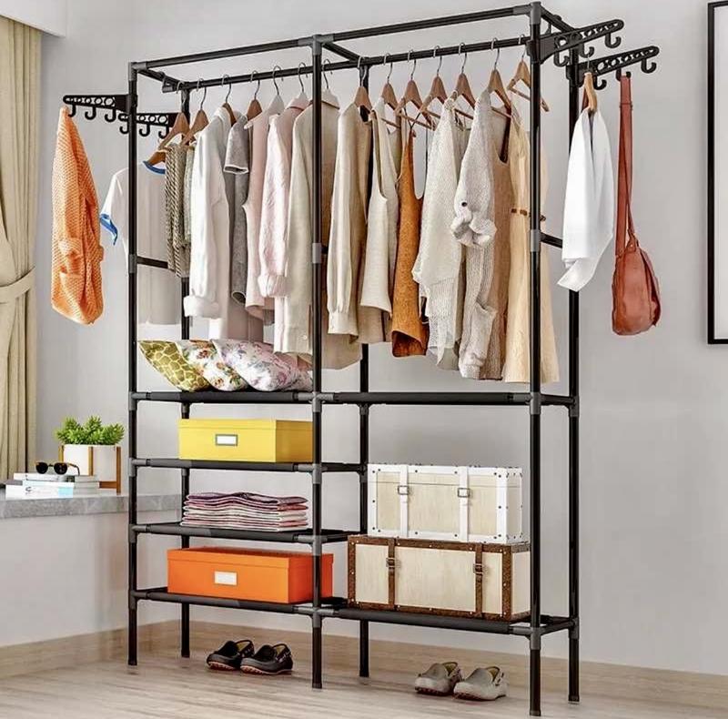 Вешалка стойкая для одежды (157х105х80 см) Simple Coat Rack Double Row / Телескопическая вешалка с полками Преимущества: Качественные материалы Стильный дизайн; Прочная конструкция; Простая и быстрая сборка; Компактные размеры Вешалка для одежды в минималистичном стиле отлично решает проблему с местом для хранения одежды. Она имеет трубчатый стальной каркас с порошковым покрытием, благодаря которому вешалка легкая и в то же время устойчивая и прочная, и ее можно перемещать без усилий. Шесть полок изготовлены из экологически чистого нетканого полотна и предназначены для удобного хранения ваших сумок, обуви и других небольших предметов. Вешалка также имеет четыре боковых кронштейна с крючками, которые служат дополнительным местом для хранения длинной одежды, таких как пальто и куртки. Характеристики: Тип: напольная стойка; Материал: нержавеющая сталь, пластик, водонепроницаемая ткань; Тип конструкции: складной; Цвет: черный; Размеры: 157х105х80 см Вес: 2,8 кг.