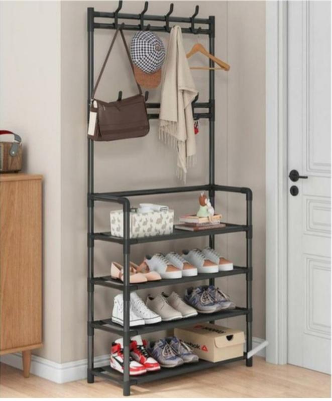 Мрієте про організовану та стильну передпокій? Вішалка стійка збірна для підлоги – це ідеальне рішення! Ця практична та функціональна вішалка допоможе вам розмістити одяг, взуття та аксесуари в одному місці. Завдяки компактним розмірам вона чудово підійде навіть для невеликих передпокоїв. ОСОБЛИВОСТІ ТОВАРУ: Місткість: Полиці для взуття та місце для одягу. Збірна конструкція: Легке та швидке складання без спеціальних інструментів. Компактність: Оптимальні розміри для будь-якої передпокою 80×26.5×154 см. Практичність: Допомагає підтримувати порядок та організованість. Стильний дизайн: Впишеться в будь-який інтер’єр. ТЕХНІЧНІ ХАРАКТЕРИСТИКИ: Розміри: 80×26.5×154 см Матеріал: метал, пластик Колір: чорний Тип: Підлогова, збірна Додатково: Полиці для взуття.