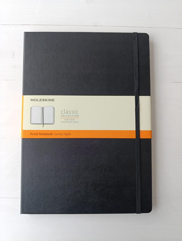 Очень большой настольный блокнот Moleskine Classic. Формат — А4, 21 х 29,7 см. Внутри много места для ежедневных записей. 192 страницы в линию из бескислотной бумаги плотностью 70 г/м2, бумага цвета слоновой кости, твердая обложка, карман для мелочей, резинка-фиксатор, закладка-ляссе. Производитель — Moleskine (Италия).