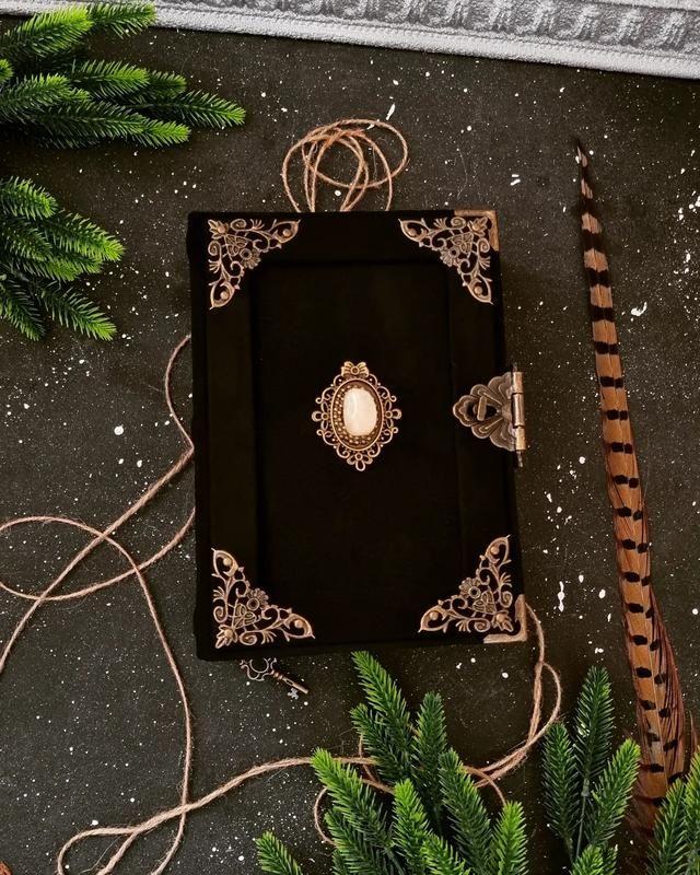 Черный велюровый гримуар с натуральным лунным камнем Фурнитура металичесская Размер книги А5 21х15см Вмещает 600 страниц крафт Края тонированы Закрывается на замочек без ключа Товар под заказ