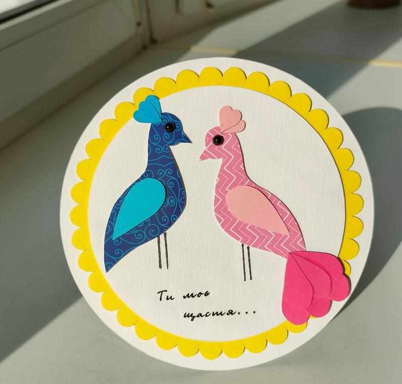 Открытка ручной работы, изготовленная из дизайнерского картона и дизайнерской бумаги, диаметр 15 см, сзади имеет опору (как на рамке с фото)