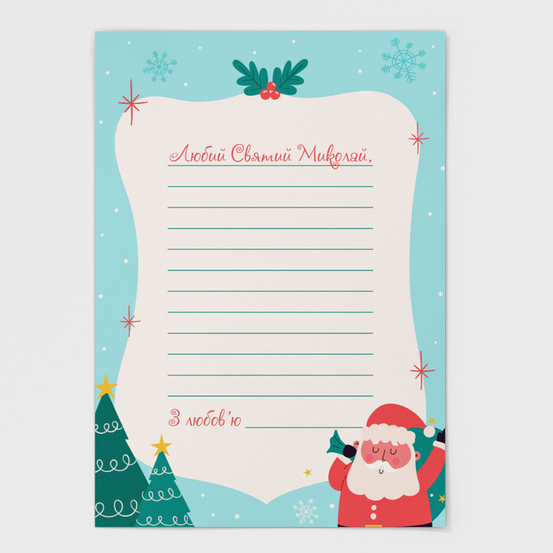 Л000008 Перетворіть момент написання листа чарівним із нашою заготівлею листа Святому Миколаю або Санті Клаусу. Ця дивовижна листівка формату А5 виготовлена з високоякісного крейдованого матового паперу вагою 350 грам, що надає йому міцності та елегантності. Характеристики: 💌 Розмір А5: Ідеальні розміри для написання серйозного чи веселого послання Святому Миколаю. Ця листівка не тільки чудово вписується в будь-який формат листа, а й створює особливе відчуття очікування дива. 🎨 Крейдований матовий папір 350 грам: Завдяки використанню якісного паперу, ваш лист виглядатиме стильно та привабливо. Матове оздоблення додає їй елегантності, а вага паперу надає міцності. 🌈 Кольоровий друк: Яскраві та насичені кольори надають вашому посланню Святому Миколаю додаткові чаклунства. Кожна деталь оформлення опрацьована із турботою, щоб створити воістину неповторний продукт. 📦 Зручна упаковка - зип пакетик: Листівка поставляється у зручному та захищеному зип-пакетику, що гарантує збереження ідеального виду вашої заготовки листа до моменту відправки. Ця заготівля листа стане чудовим способом внести чари у святкову атмосферу. Напишіть свої найтепліші та найщиріші слова, використовуючи нашу заготівлю, та створіть неповторний момент для себе та ваших близьких. Нехай лист Святого Миколая стане особливим моментом напередодні свята!