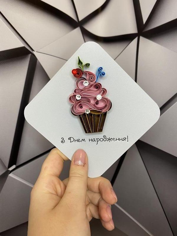 Вітальна листівочка з кексиком в техніці квіллінг. Розмір : 11х11 см Матеріал обкладинки:дизайнерський картон (щільний ) Дизайн :стрічки для квілінгу 7 мм. Можливе виготовлення на замовлення ( підбір кольору та надпису) Пишіть коментарі до замвлення Товар под заказ