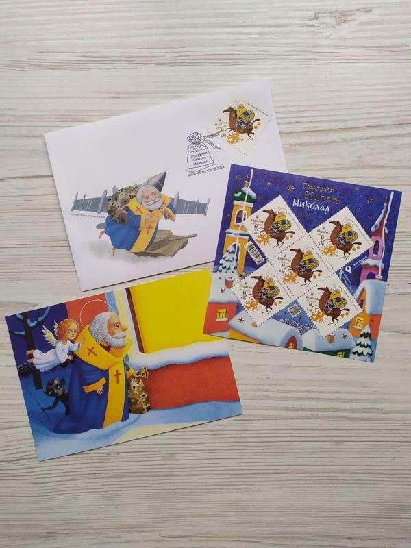 Поштовий набір "подарунки святого миколая": конверт з погашенням, аркуш марок, листівка