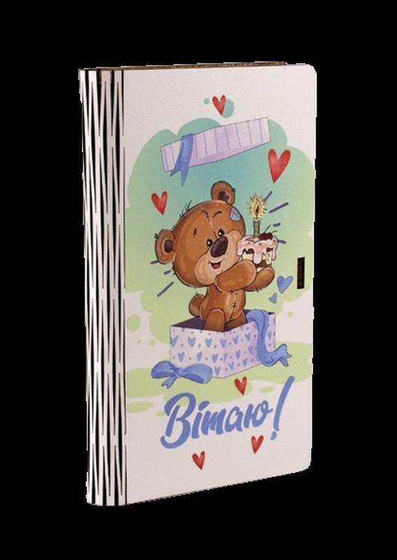 Конверт для денег Приветствую Мишка Деревянный конверт. Выполнен из ламинированного ДВП (3мм) с использованием ЕКО печати, который устойчив к механическим повреждениям и воздействию ультрафиолетовых лучей. Конверт может стать креативным приложением к Вашему подарку и денежным купюрам или мелким аксессуарам. Длина - 19 см. Ширина - 10 см. Высота - 2 см.