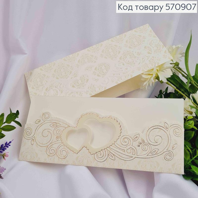 Конверт бежевый с тиснением и кружевом, сердечка, 19*9,5см