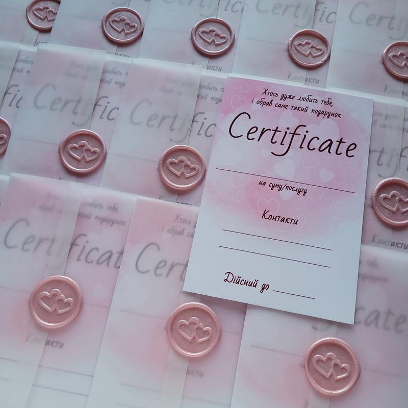 Подарочные сертификаты Карточка с текстом, обвертка из колики, сургучный отжим. Размер 10*15 см 10 шт - 600 грн