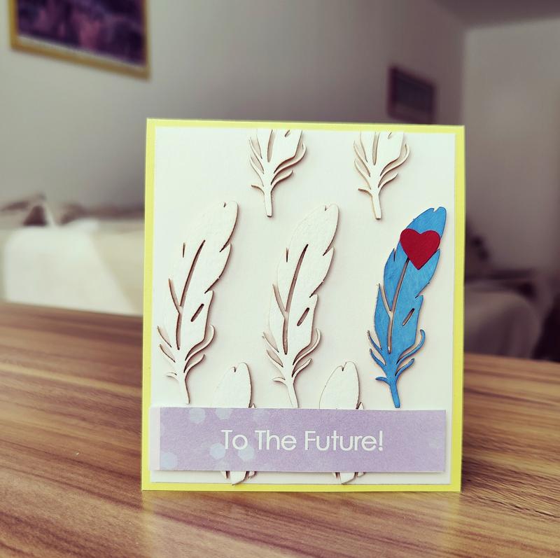 Листівка з пір'їнами "в майбутнє" to the future, синьо-жовтий