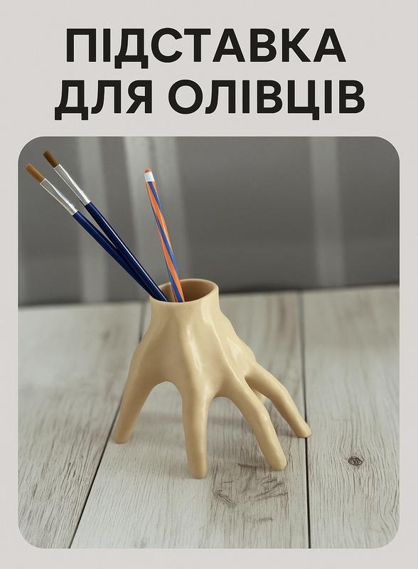 Органайзер для ручок, олівців або пензлів у вигляді руки Оригінальний аксесуар для вашого робочого столу або творчої майстерні! ✔️ Виготовлений за технологією 3D-друку ✔️ Матеріал -- PLA-пластик (екологічний, легкий і міцний) ✔️ Унікальний дизайн у формі руки ✔️ Підходить для офісу, дому, школи, майстерні ✔️ Гарний варіант для подарунка 📐 Розміри: ~12×14 ⚖️ Вага: 69 г 🎨 Колір: бежевий (можливе виготовлення в інших кольорах за запитом) 📦 Вироблено в Україні. Власне виробництво.