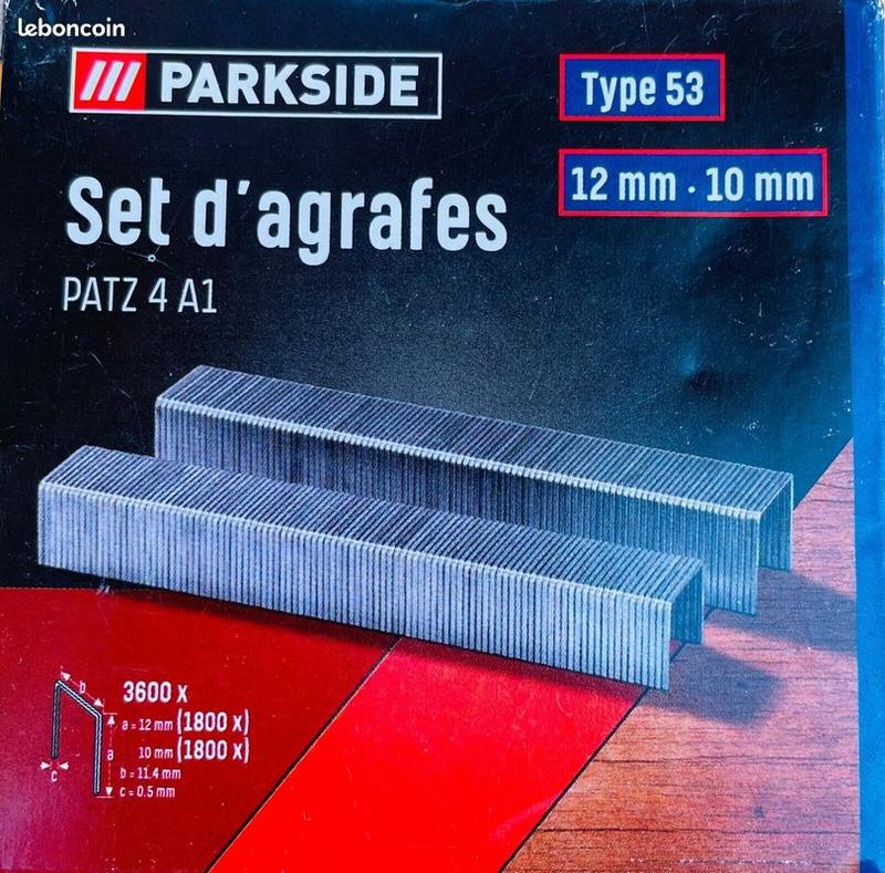 Набор скоб Parkside PATZ 4 A1 (3600 шт., Type 53, 10 мм / 12 мм) – качественные металлические скобы для строительных и мебельных степлеров, предназначенные для работы с деревом, тканью, картоном, кожей и другими материалами. Отлично подходят для ремонтных и обивочных работ. * * * Характеристики: - Бренд: Parkside - Модель: PATZ 4 A1 - Тип скоб: Type 53 - Количество в наборе: 3600 шт. - 1800 шт. – длина 12 мм - 1800 шт. – длина 10 мм - Материал: Высокопрочная оцинкованная сталь - Размеры: - Высота (a): 10 мм / 12 мм - Ширина (b): 11,4 мм - Товщина (c): 0,5 мм - Назначение: Для мебельных, строительных и универсальных степлеров - Область применения: Ремонт, монтаж, мебельное производство, обивка, крепление материалов * * * Преимущества: ✔ Совместимость с большинством механических и электрических степлеров ✔ Оцинкированное покрытие для защиты от коррозии ✔ Острые края для легкого вхождения в материал ✔ Идеально подходят для работы с деревом, тканью, кожей, пластиком, картоном ✔ Большой набор – хватит на долгий срок * * * Применение: 📌 Мебельное производство (обивка, крепления текстиля, ремонты) 📌 Фиксация декоративных материалов 📌 Строительные и монтажные работы 📌 Закрепление кабелей, тонких деревянных панелей, картона, кожи
