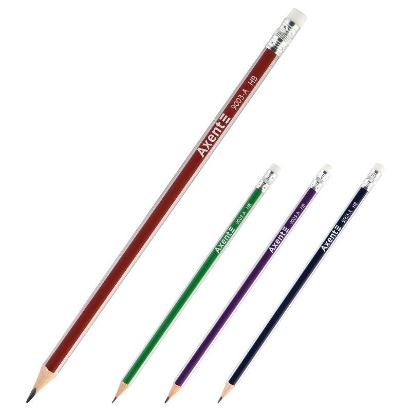 Карандаш графитный Axent 9003-A с ластиком. Эргономичный трёхгранный корпус из высококачественной древесины защищает грифель от ударов. Твёрдость HB. Покрытие: матовый цветной корпус. Ассортимент цветов корпуса: красный, фиолетовый, синий, зеленый. Длина 189 мм, диаметр 7 мм.