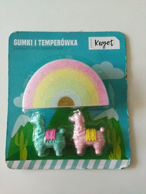 В комплекте две резинки в виде ламы и точилка на два отверстия, один для обычных карандашей, более чем для более толстых. Польша.