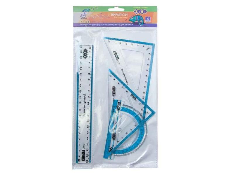 Набор для черчения от ZiBi – для обучения измерению и чертежу. Может использоваться школьниками, студентами, преподавателями, используется на уроках математики, черчения, геометрии, в технических кружках и при самостоятельной подготовке. • прозрачный пластик с голубой полоской обеспечивает удобство в использовании и эстетичный вид • все шкалы нанесены четким, устойчивым к истиранию печатью • пластик – ударопрочный, не подвержен царапинам и выгоранию под действием ультрафиолета • комплект позволяет выполнять широкий спектр чертежных и измерительных задач В набор входят: • линейка 20 см с двумя шкалами (санметры и миллиметры) • косынец 90°/45° с линейной шкалой до 10 см • косынец 90°/60°/30° с линейной шкалой до 14 см • транспортир с двумя шкалами от 0° до 180° и линейной шкалой до 10 см Технические характеристики • Цвет - голубой • Тонировки - нет • Серия - Kids line • Тип изделия - набор Состав Пластик