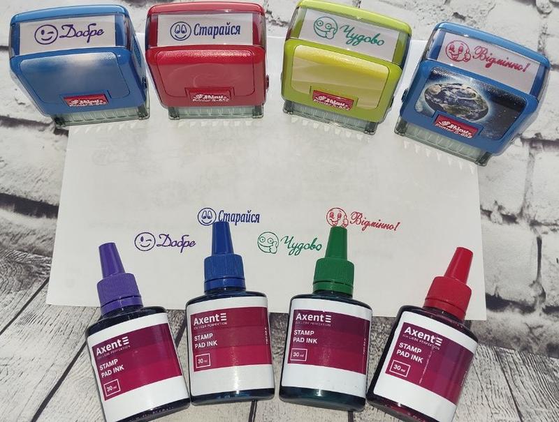 В набор входит 4 штампа s-852 c оценками "Старайся" "Добре" "Чудово" "Відмінно" со смайликами. Отпечаток штампа 6х38 мм. Штемпельная краска на водной основе тм. Axent. Объём каждой бутылочки - 30 мл. Цвета: синий, зелёный, фиолетовый, красный. Есть возможность менять цвета оттисков. По предоплате поменяем цвета на имеющиеся: красный, синий, зелёный, фиолетовый, чёрный.