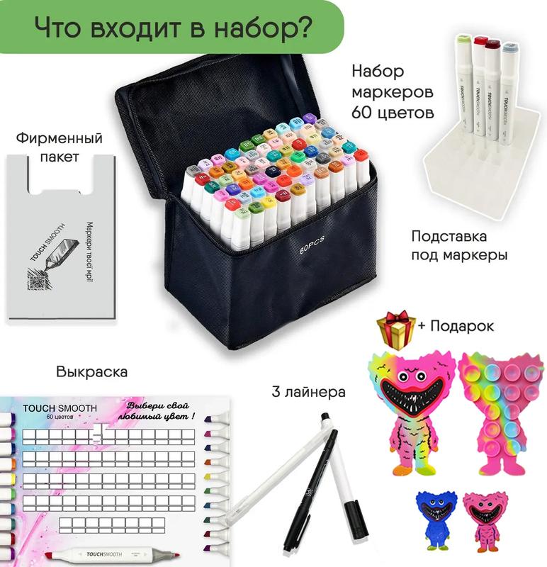 Маркери Тач смус Арт - кращий варіант представлений на українському ринку! Сертифікований продукт, повний комплект. Купуючи наші маркери Ви отримуєте не тільки самі високоякісні маркери, з найбільшим наповненням чорнила, але і так само : Підставку під кожен маркер Вимальовку для кожного кольору Вашого Набору Три лайнера , два чорного кольору і бликовую ручку Брендований пакет, для того що б маркери завжди були з Вами І солодкий бонус від нашого магазину, для натхнення ☺️ Сертифіковані маркери найкращої якості, з повним комплектом ! Спиртові маркери Touch Smooth для тих, хто захоплюється малюванням і каліграфією, любить створювати комікси і мальовничі ескізи. У наборі 60 маркерів різних кольорів. Корпус пластиковий, гладкий. Ковпачки щільно закриваються. Кожен маркер має два наконечника різної форми для різного типу робіт. Загострений наконечник для тонких ліній і контурів. Плоский наконечник зі скошеним краєм для широких штрихів. Для зручності розпізнавання типу пера кінці маркерів пофарбовані різними кольорами. Кожен колір має свій цифровий код, який нанесений на ковпачок маркера. Чорнило на спиртовій основі добре вбираються в папір, тому рекомендується використовувати щільні листи або картон. Кольори добре змішуються між собою, плавний перехід відтінків. Хороший вибір відтінків для шкіри людини Довжина маркера 16,8 см. У ПОДАРУНОК СКВІДОПОП ХАГІ ВАГІ ВАШІЙ ДИТИНІ! Іграшка-антистрес Сквідопоп має присоски, як у восьминога, завдяки чому іграшка легко прилипає до гладких поверхонь. Відлипаючи, видає приємний звук. Іграшка займає дитину, знімає стрес та заспокоює. Виготовлений із міцного та безпечного матеріалу.