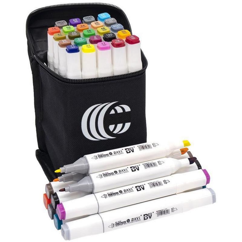 Набор двусторонних фломастеров / скетч маркеров на спиртовой основе. В наборе 24 штуки в сумке. С одной стороны обычный фломастер, с другой стороны скошенный маркер. Каждый цвет имеет свой цифровой код, который нанесен на колпачок маркера. Колпочки плотно закрывают маркер, препятствуя высыханию. Чернила на спиртовой основе хорошо впитываются в бумагу, поэтому рекомендуется использовать плотные листы или картон. Размер сумки 10х8х15см