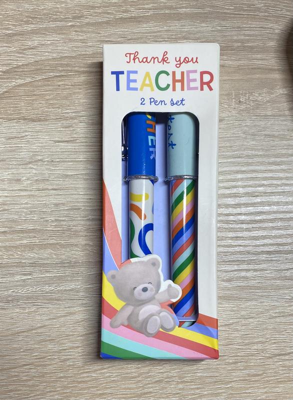 Подарунковий набір ручок "Thank You Teacher" — ідеальний спосіб висловити подяку улюбленому вчителю. Цей стильний комплект із двох ручок, запакований у красиву коробку, стане незабутнім і корисним подарунком. Одна ручка прикрашена яскравими різнокольоровими смужками, а інша — оригінальним візерунком із різнокольорових овалів. На ручках є написи "TEACHER", що підкреслюють їхнє призначення. Коробка оформлена милим ведмедиком та райдужними візерунками, що робить подарунок ще більш зворушливим. Цей набір — не просто канцелярське приладдя, а справжній символ поваги та вдячності. Він стане чудовим доповненням до столу викладача і буде нагадувати про вашу увагу щоразу, коли він буде ним користуватися. Ідеально підходить як подарунок до Дня вчителя, на закінчення навчального року або з будь-якої іншої нагоди. Покажіть, як ви цінуєте їхню працю, за допомогою цього унікального та продуманого подарунка!