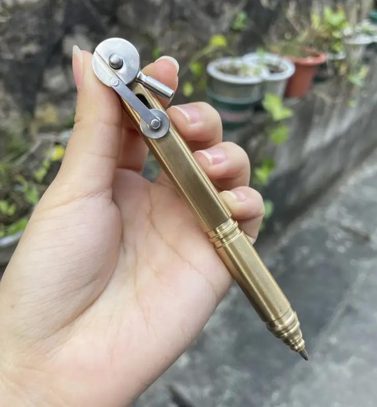 Ретро-ручка, латунь/металл. Металлическая (латунная) тяжелая шариковая ручка с интересным механизмом подачи стержня, цвет пасты-черный. Размеры: длина 12,50 см., толщина 1,20 см., вес 86.00 грм., к ручке в продаже имеются запасные стержни чёрного и синего цвета (цена 25,00 грн., за 1 шт.)
