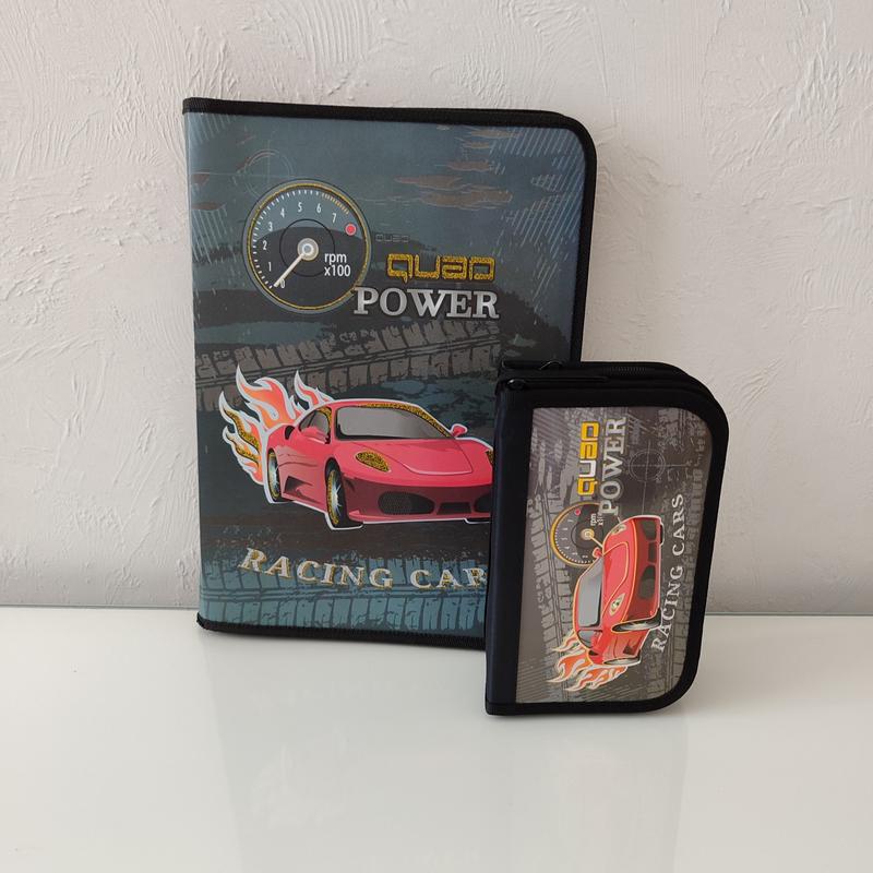 Пенал черного цвета с автомобилем и папка формата а4 на молнии