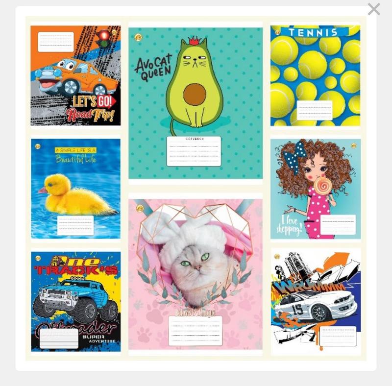 Зошит з повнокольоровою картонною твердою обкладинкою. Внутрішній блок - папір офсетний, білизна 98%, щільність внутрішнього блока 55 г/м2, поля червоні. Обкладинка - крейдований папір щільністю 170 г/м2. Ліновка - коса лінія, 12 аркушів. У наборі 25 зошитів.