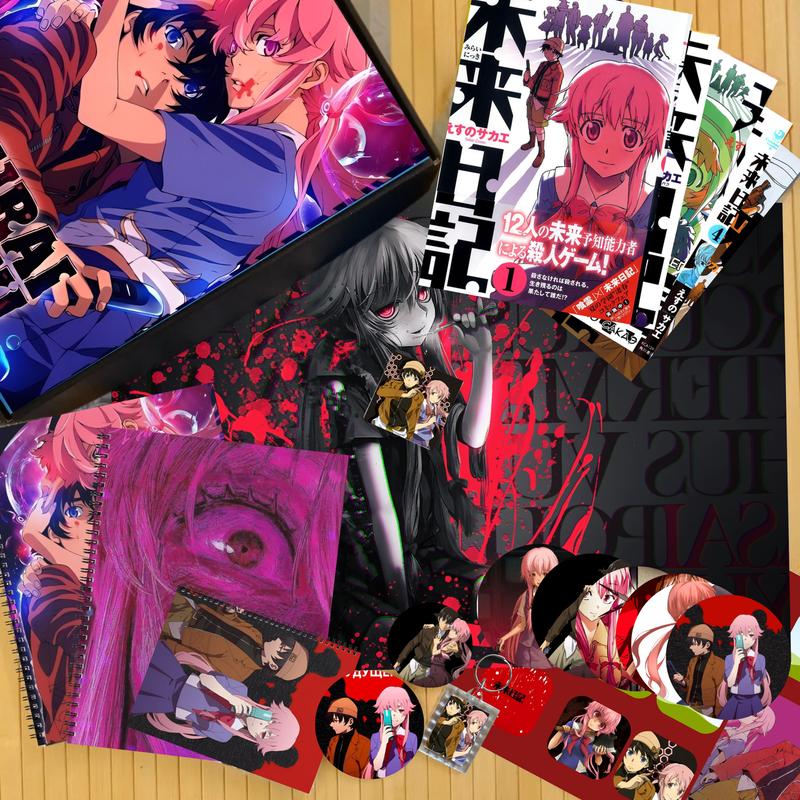 Подарочный бокс Дневник будущего Mirai Nikki 18 предметов - коробка - постер - скетчбук А5 - тетрадь на пружине - блокнот на пружине - магнит - брелок - значок 5,6 см - значок 7,5 см - комплект из 5 томов манги на рус яз (1-5т) - стикерпак А4 (непрорезной) - набор больших стикеров 7,5 см