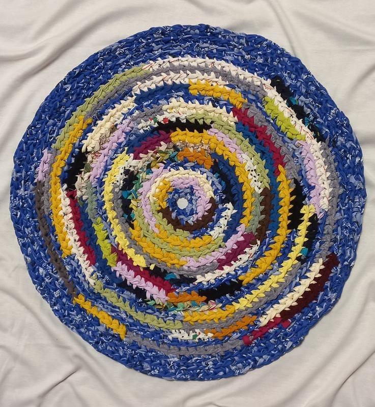 Коврик из трикотажных полосок, диаметр 55 см Дополнительные характеристики: Цвет: Разные цвета Тематика декора, рисунка: Абстракция Форма ковра: Структурный Назначение ковра/дорожки: Универсальное Тип: Ковровая дорожка