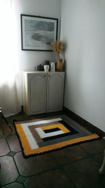 Коврик вязаный из полиэфирного шнура. Возможна комбинация различных цветов. Размер образца 115 см на 100см. Возможно изменение размера. Товар под заказ
