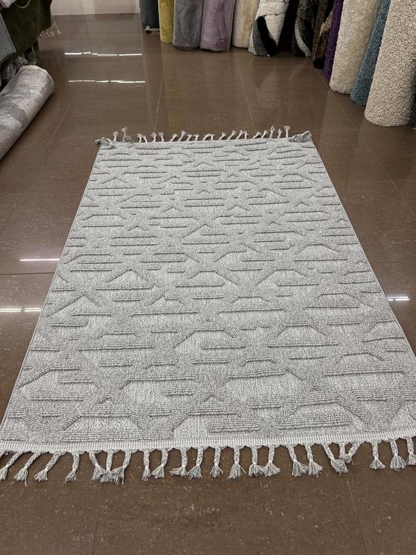 Тонкий килим з рельєфним ворсом на тканій основі. Розмір 1.2х1.8 м прямокутний Склад основи джгут Склад ворсу поліестер Можна прати, хімчистити Є інші розміри більші або менші. Китиці можна прибрати і зробити обробку оверлоком. Підрізаємо під ваш розмір.