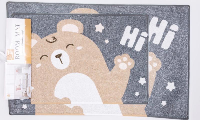 Набір складається з двох прямокутних килимків, які ідеально підходять для оформлення дитячої кімнати. Завдяки різним розмірам — 80×50 см та 60×40 см — їх можна розмістити біля ліжка, ігрової зони або вхідних дверей, забезпечуючи комфорт і декоративний акцент. Обидва килимки мають однаковий стиль оформлення, що створює візуальну гармонію в інтер’єрі. Матеріал ПВХ забезпечує зносостійкість, водонепроникність і легкість у догляді. Поверхня килимків м’яка на дотик, а нижня частина має протиковзку основу, що утримує їх на місці навіть на гладкій підлозі. Загальна вага набору — 1.4 кг — сприяє стабільності без потреби у додатковому кріпленні. Дизайн із зображенням ведмедика, зірочок і написом “Hi!” додає кімнаті затишку та грайливості. Такий набір не лише виконує практичну функцію, а й стає частиною тематичного оформлення дитячого простору. Характеристики: Кількість: 2 штуки Розміри: 80×50 см / 60×40 см Матеріал: ПВХ Вага: 1.4 кг