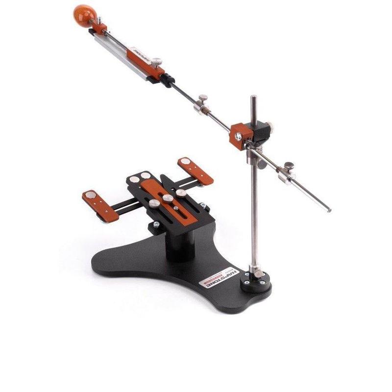 Описание точильной системы Hapstone V8 Standard, Трехточечный упор: Система очень вариативна, в зависимости от модели, поддерживает столик для заточки ножниц, адаптер для линзообразной заточки и другие аксессуары. Точильная система Стандарт Hapstone V8 представляет собой высокотехнологичное устройство с массой настроек для заточки всех видов ножей. Точильная система Хапстоун V8 Standard Трехточечный упор базируется на расширяющем магнитном столике и сочетает в себе максимальную универсальность и высокую точность заточки. Модель V8 по возможностям наиболее близка к предыдущей модели Hapstone V7. Главным новшеством является расширительный столик, помогающий затачивать длинные ножи без их перемещения. Трехточечный упор позволяет точно позиционировать нож при перевороте. Основные преимущества - Стальная база с пьедесталом для модулей - Шарнирный узел с вращением на 360° и парковочным крюком - Линейный подшипник обеспечивает минимально возможное трение, не требует масла и чистки - Универсальный автопостраивающийся держатель брусков с площадкой для цифрового угломера - Поддержка брусков длиной от 10 до 16 см, в том числе Edge Pro и KME - Легкая горизонтальная штанга - Деревянная ручка - Прорезиненные ножки для работы на любой поверхности - Совместимые модули: поворотный механизм (модуль R2), расширительный столик (модуль V8), маленький столик (модуль M3), держатель для ножниц - Совместимые аксессуары: Адаптер тонкой настройки, стопперы с пружиной, адаптер вертикальный поддержки (для V8 /M3)