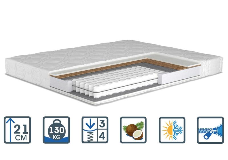 Матрац SOFIA NEW від Матролюкс відмінно доповнить Ваше спальне місце. Блок типу Pocket Spring, завдяки незалежним пружинам, гарантує ідеальну точкову підтримку Вашого тіла і правильно розподіляє навантаження. Ефект Зима-Літо, який забезпечує додаткова прошивка чохла, є ще однією перевагою матраца. За рахунок використання в наповненні шару з волокна кокоса літня сторона більш жорстка, а чохол матраца з цього боку простьобаний бавовною. З зимової сторони, яка традиційно м'якше, прошивка чохла виконана з теплою вовни. Також уваги заслуговує і зовнішній вигляд чохла. Акуратний дизайн і м'який рельєф роблять його дуже привабливим. Завдяки своїй універсальності матрац Софія підійде і тим, хто вважає за краще сон на твердій поверхні, і любителям спати на більш м'якому ліжку. Характеристики моделі: Шари наповнення: Тип матраца - двосторонній Зима / Літо Жорсткість: - «Зима» - III - «Літо» - IV Висота - до 21 см Єврокаркас Посилення сталевою рамою двоспальних моделей Зйомний чохол глибокої прошивки - жаккард, на блискавці Навантаження - до 130 кг на спальне місце Прошивка чохла - вовна 100% Пінополіуретан Захисний шар термоволокна Блок пружин Pocket Spring Thermofiber Койра кокосу Пінополіуретан Прошивка чохла - бавовна 100% Матрац SOFIA NEW не потребує реклами. Популярність модель заслужила, оскільки має демократичну ціну і чудову якість. Купити матрац СОФІЯ дуже просто. Дзвоніть за телефонами, які вказані на сайті нашого інтернет-магазину, або заповніть форму замовлення.