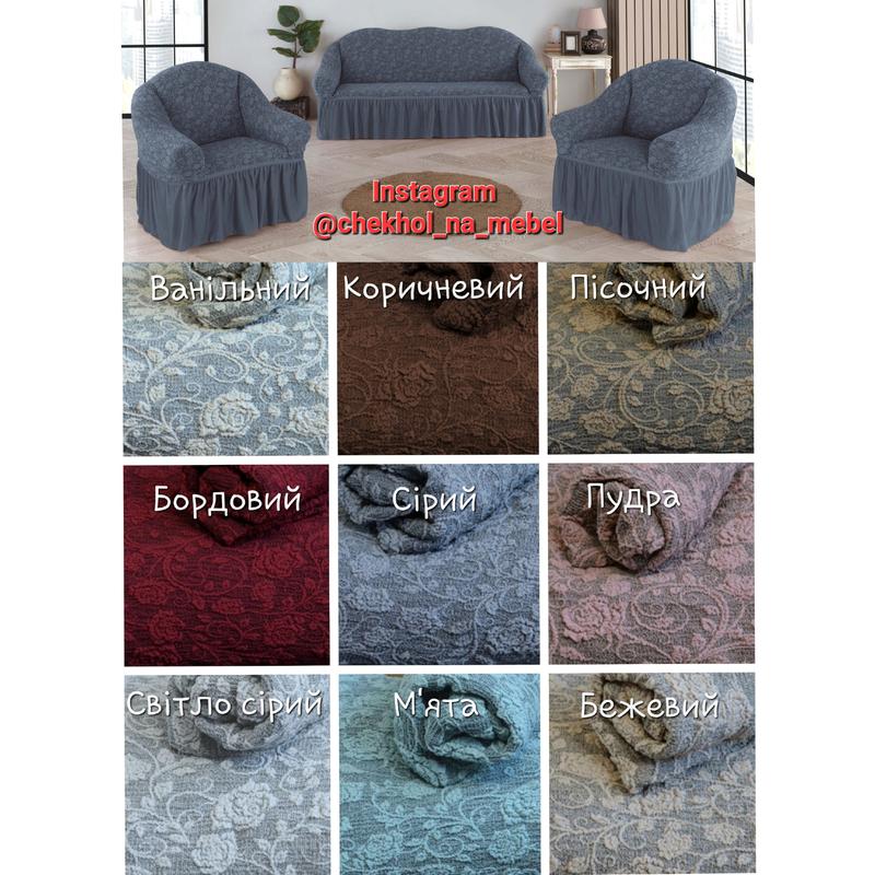 В ПРОДАЖИ НАБОР ЧОХЛИВА НА ДИВАН И ДВА КРЕСЛА!!! Больше не нужно пользоваться услугами химчистки, или самостоятельно пытаться справиться с загрязнениями, достаточно приобрести чехлы на мягкую мебель. И они защитят от пятен, царапин и других повреждений. Особенно актуален в домах с детьми и животными.